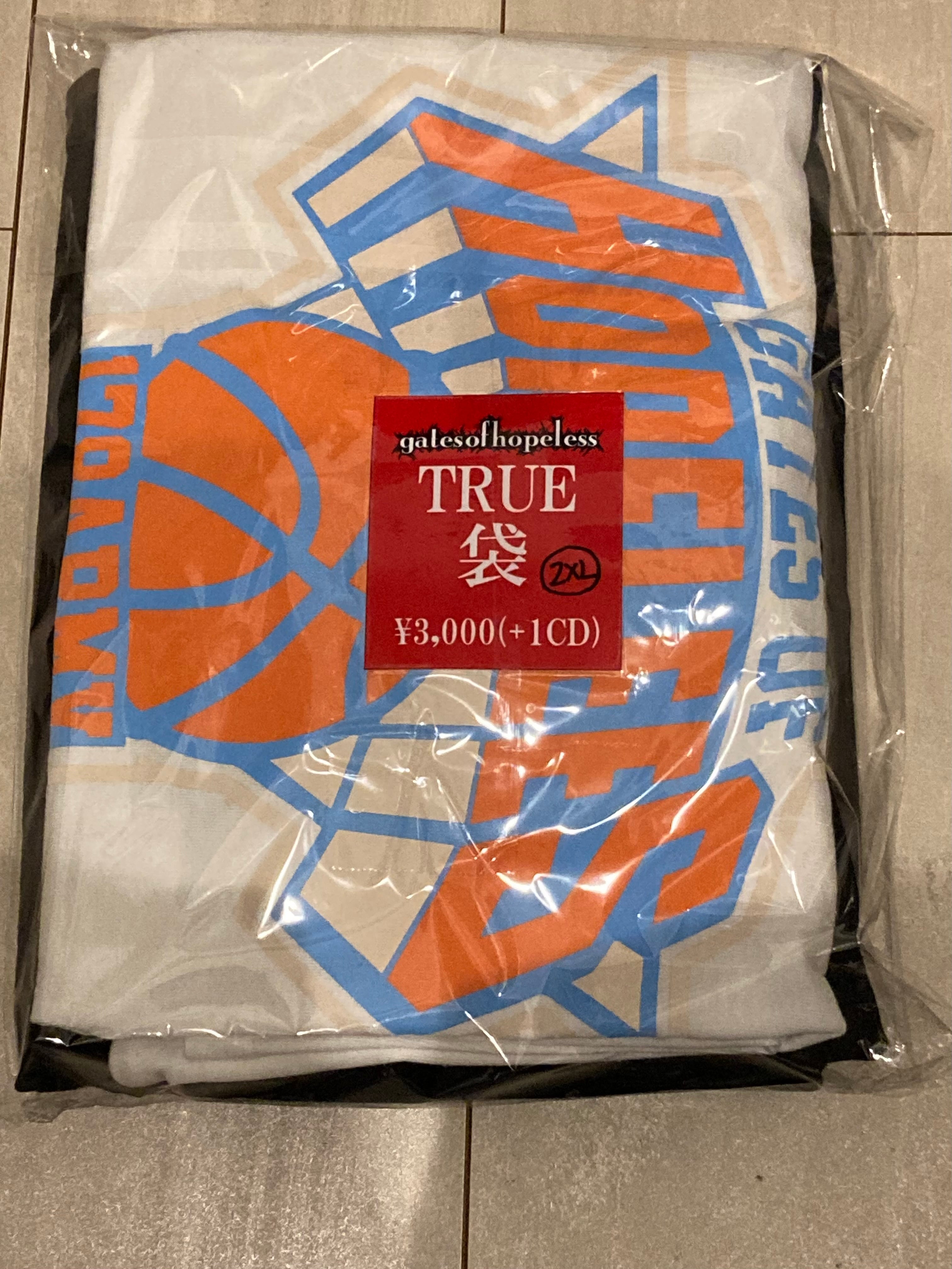 GATES OF HOPELESSマーチをセットにしたのTRUEな福袋、その名も『トゥル袋』が前回よりスマートなタイプで登場!Tシャツ2枚+GATES OF HOPELESSのディスコグラフィー付きのセット内容で間違いないお得セット!!一部非売品や未発売カラーなどもあります!