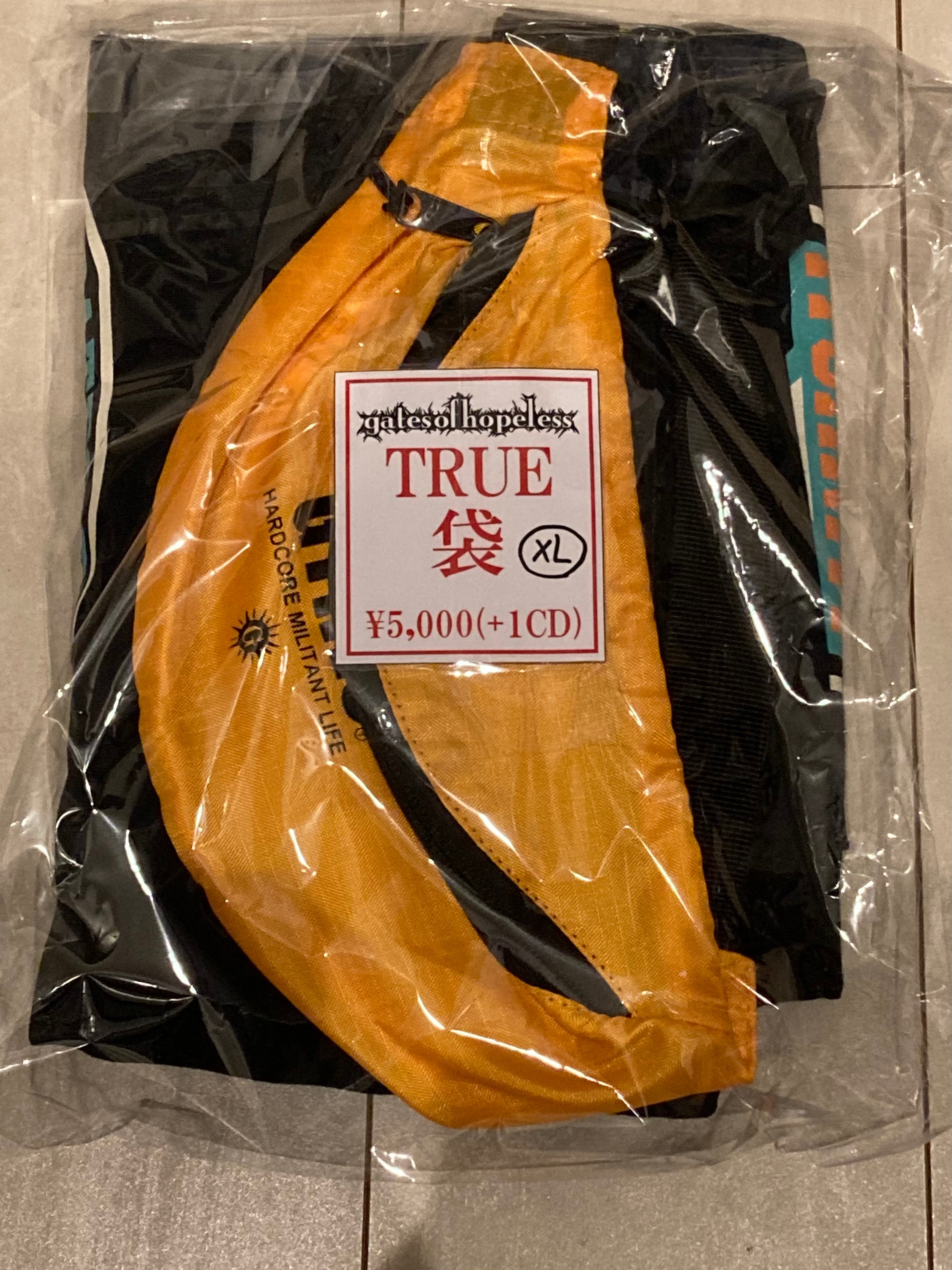 GATES OF HOPELESSマーチをセットにしたのTRUEな福袋、その名も『トゥル袋』が前回よりスマートなタイプで登場!ロンT1枚+ポーチ+GATES OF HOPELESSのディスコグラフィー付きのセット内容で間違いないお得セット!!一部非売品や未発売カラーなどもあります!